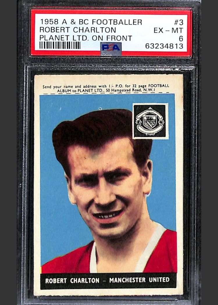 All of Bobby Charlton’s earliest cards date from 1958, the year of the Munich Air Disaster and the point at which he established himself as a first-team regular at Manchester United.