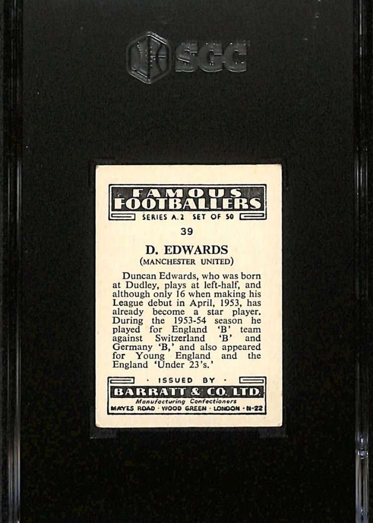 Duncan Edwards made his First Division debut in April 1953, and his earliest confirmed card issues from this period date to 1954. These include the 1954 Barratt & Co Famous Footballers Series A2 #39, the 1954 Liam Devlin & Sons Famous Footballers issue, and a 1954 D.C. Thomson/The Rover Famous Footballers hand-cut issue.