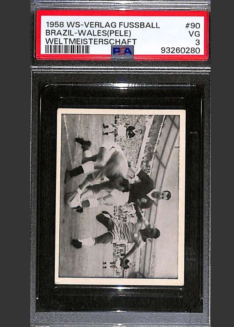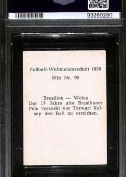 This Pelé rookie card is number 90 from the 1958 WS-Verlag Fussball collection. The card also depicts Wales defender Mel Charles and goalkeeper Jack Kelsey.