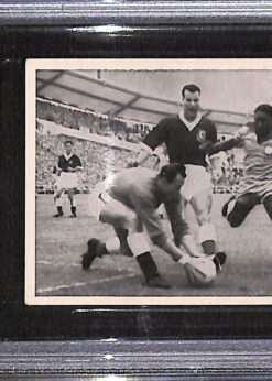 This card shows action from the 1958 FIFA World Cup quarter-final between Brazil and Wales in Gothenburg, where Pelé scored the only goal of the match. This was Pelé’s first World Cup goal at the age of 17, in a tournament where he would go on to score six goals and win his first World Cup title.