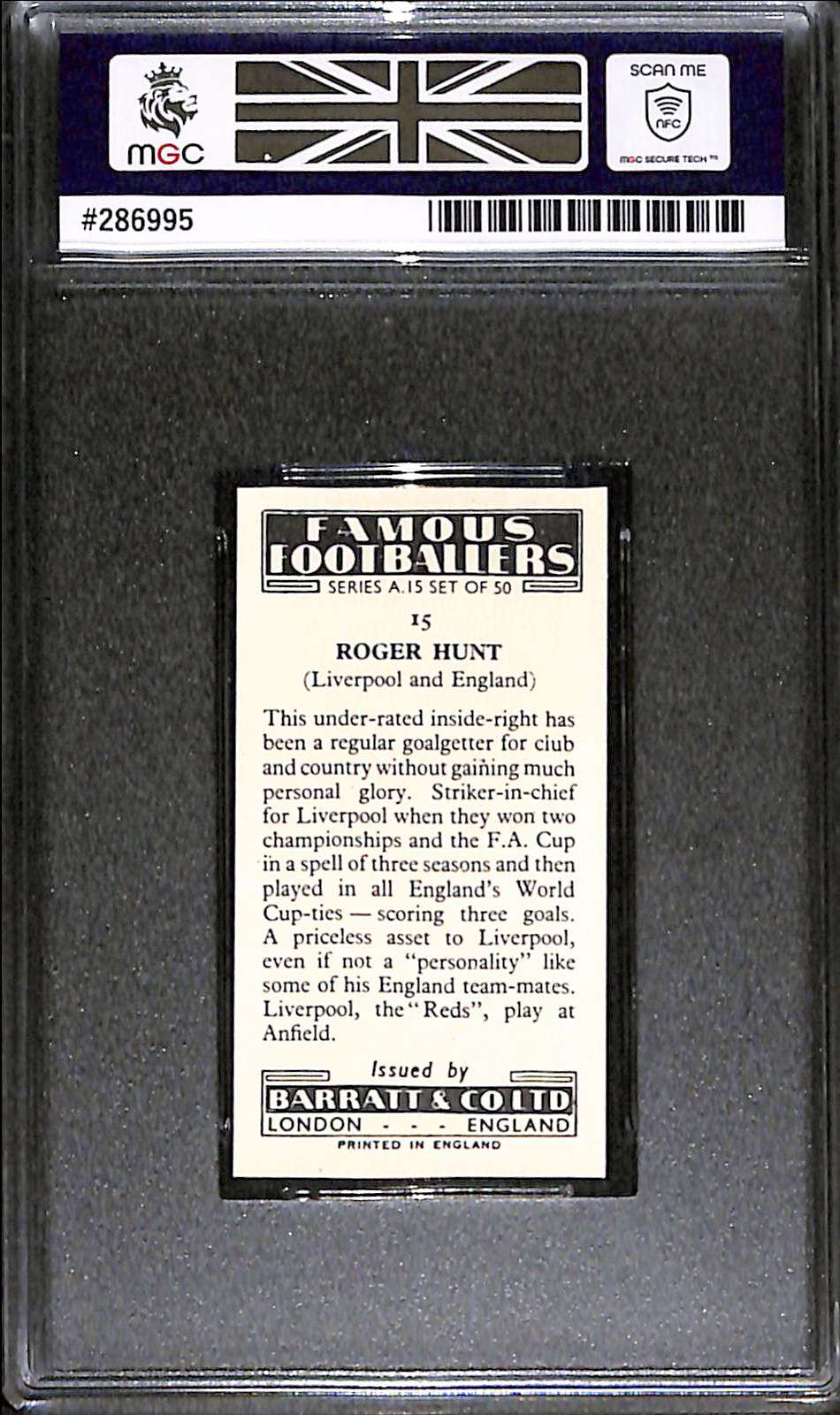 It was issued during Hunt’s Liverpool years. Hunt is a Liverpool club legend, affectionately known as “Sir Roger” by supporters, and he was the club’s all-time leading goalscorer with 285 goals until Ian Rush overtook him. He also remains Liverpool’s record league goalscorer with 244 league goals.