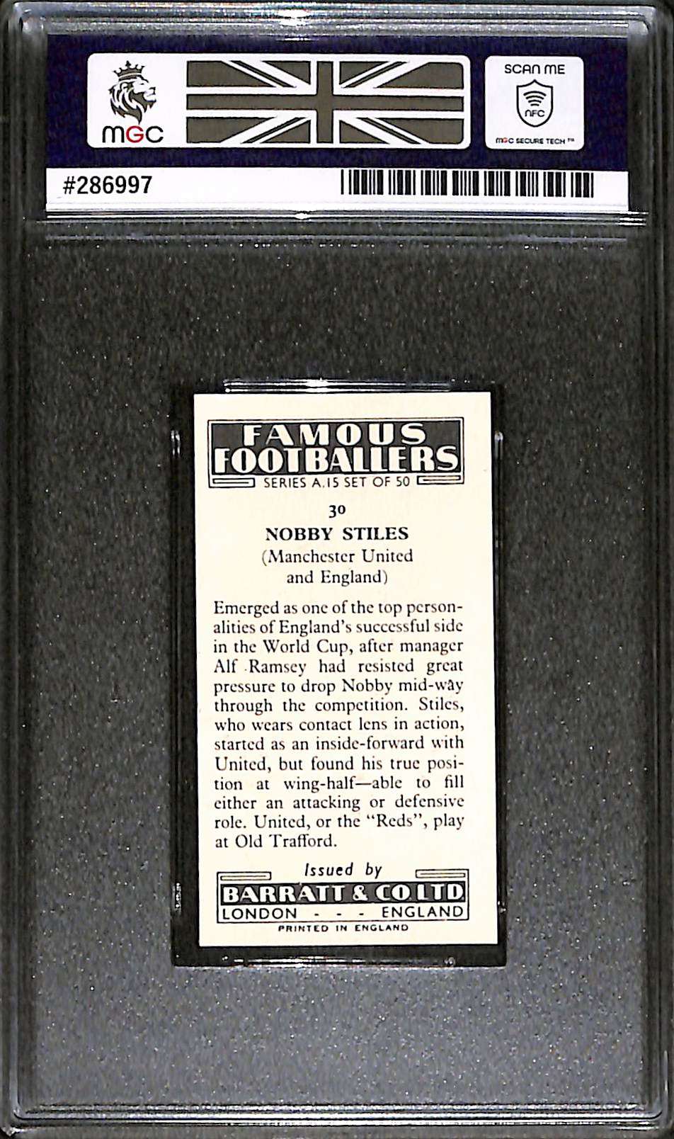 It was issued during Stiles’ Manchester United years. A Manchester United club legend and England’s 1966 World Cup winner, he played every minute of the 1966 campaign and is famously remembered for marking Eusébio in the semi-final.