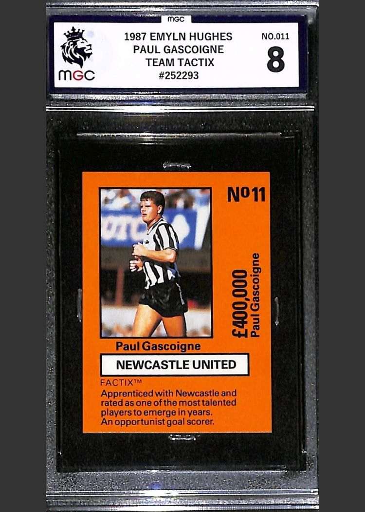 This Paul Gascoigne card is number 11 from the 1987 Emlyn Hughes Team Tactix collection, produced by Boss Leisure. The card has been graded MGC 8 Near Mint/Mint by Majesty Grading Company.