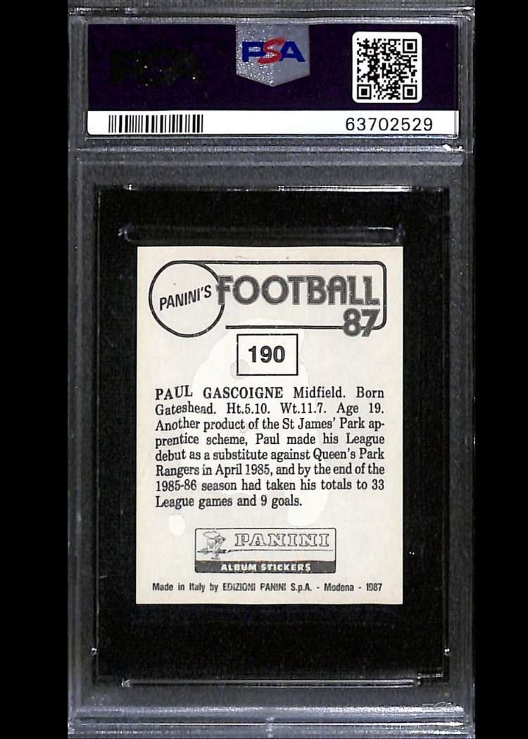 The Football 87 set documents the 1986–87 English league season and includes the earliest Panini-licensed sticker of Gascoigne, who went on to become one of England’s most talented and high-profile midfielders.