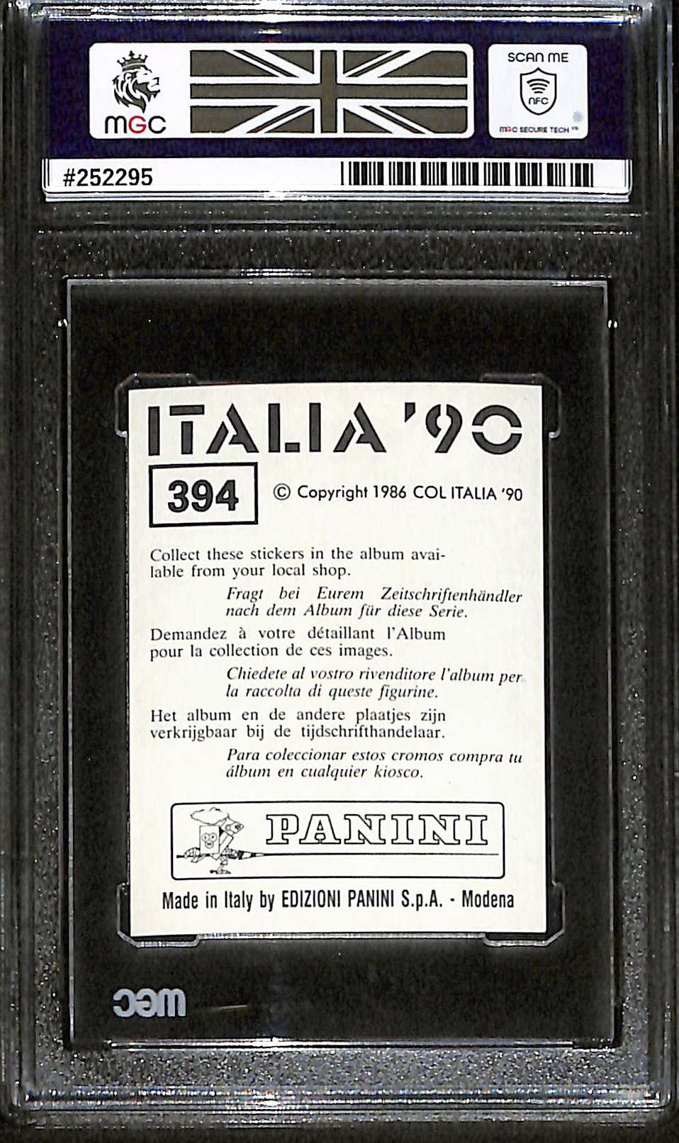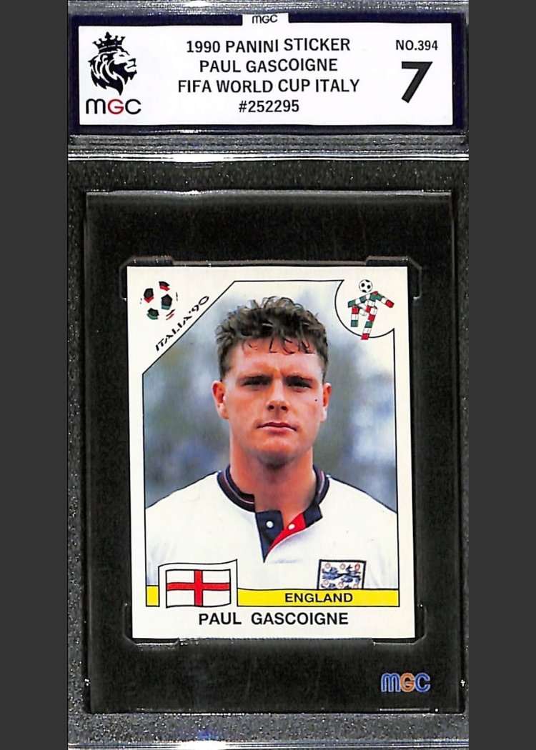 This Paul Gascoigne card is number 394 from the 1990 Panini FIFA World Cup Italia ’90 collection. The card has been graded MGC 7 Near Mint by Majesty Grading Company.