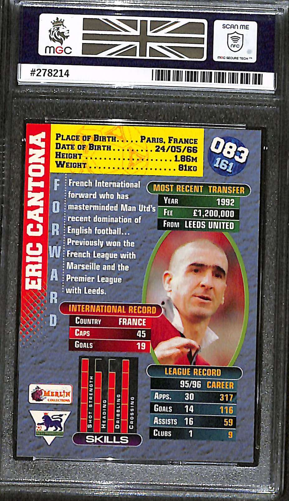 This Eric Cantona card is number 83 from the 1996 Merlin Premier Gold collection. The card has been graded MGC 9 Mint by Majesty Grading Company.