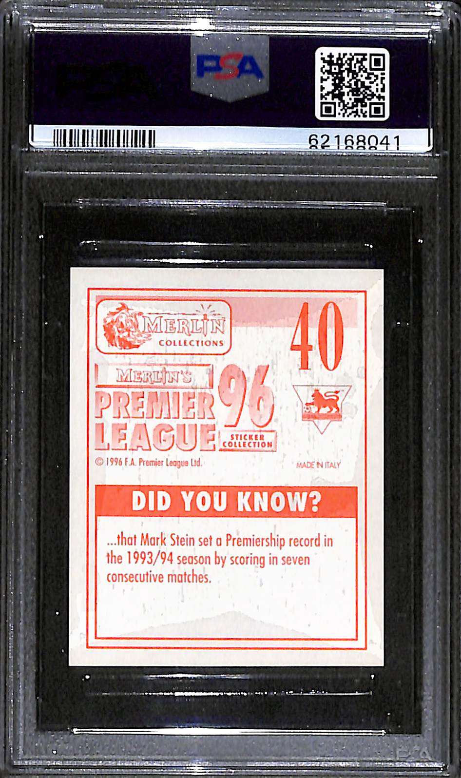 - Sticker number 40 from the 1996 Merlin’s Premier League collection.