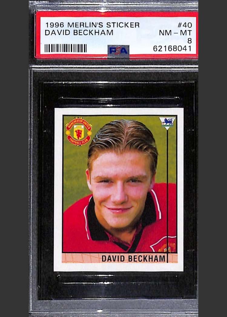This David Beckham rookie sticker is number 40 from the 1996 Merlin’s Premier League collection. The sticker has been graded PSA 8 Near Mint/Mint.