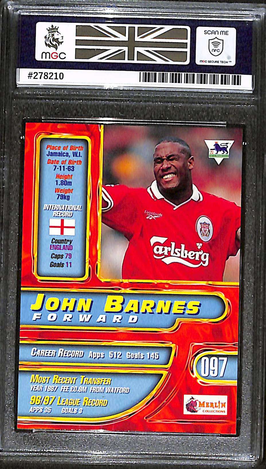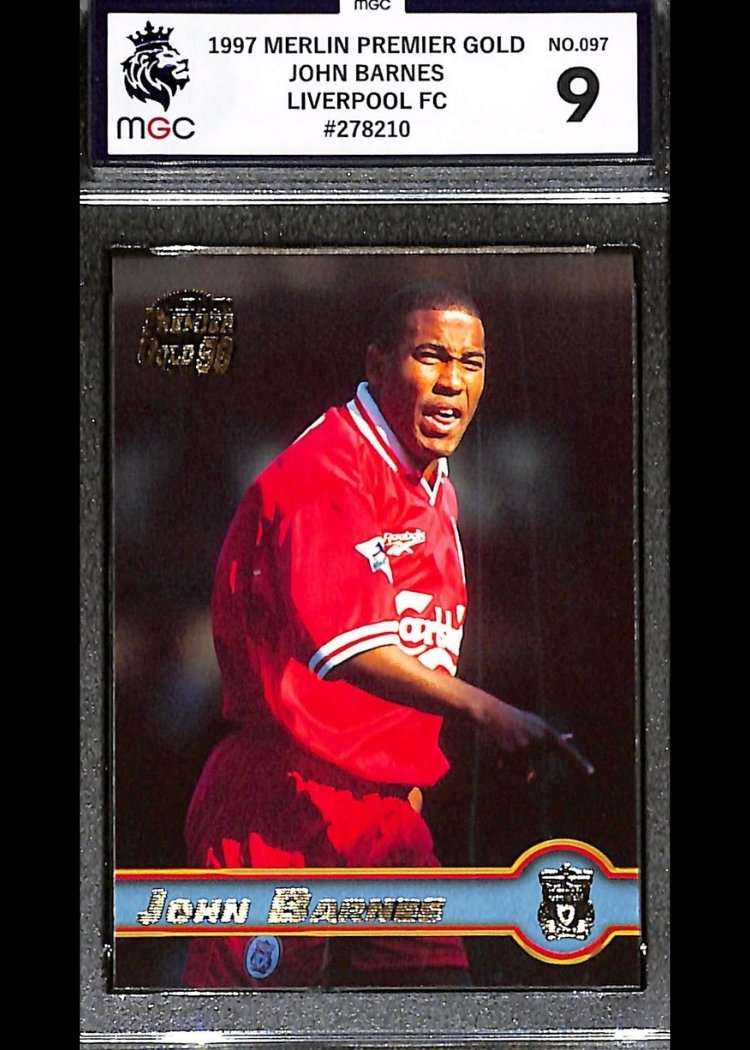This John Barnes card is number 97 from the 1997 Merlin Premier Gold series. The card has been graded MGC 9.