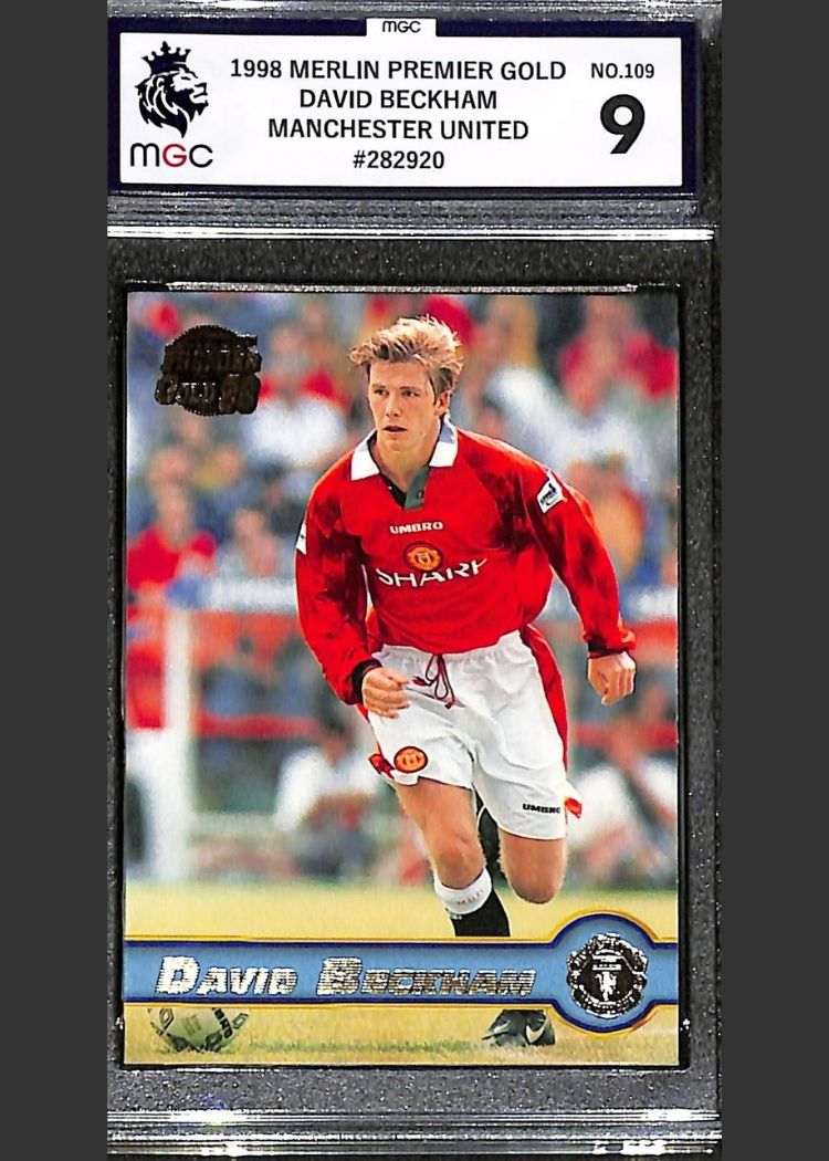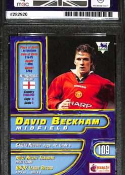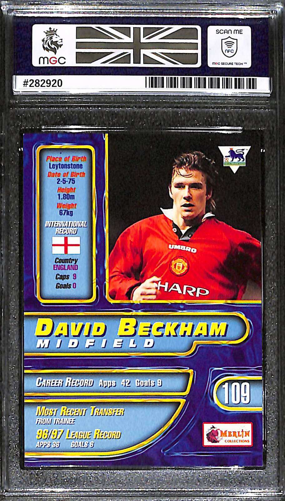 This David Beckham card is from the 1998 Merlin Premier Gold collection. The card has been graded MGC 9 Mint by Majesty Grading Company. MGC certification number 282920.