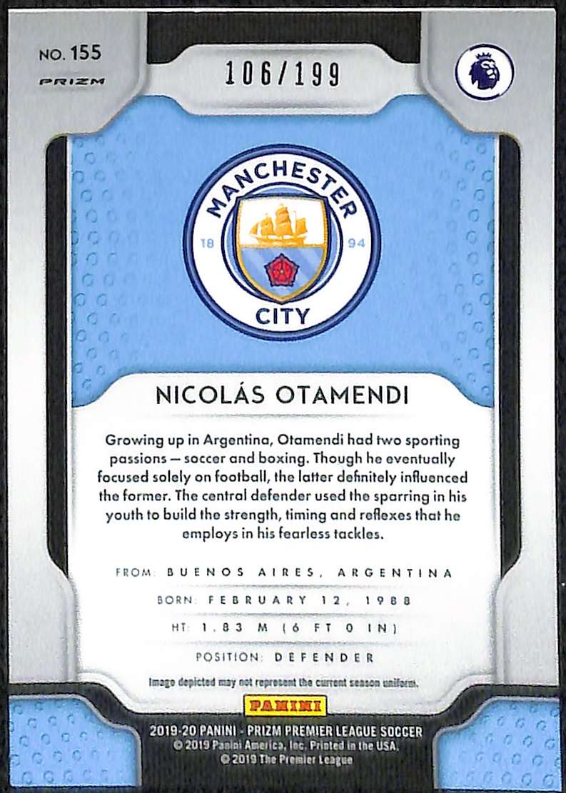 This Nicolás Otamendi Blue Prizm is card number 155 from the 2019-20 Panini Prizm Premier League collection. It is serial-numbered 106/199, with only 199 copies produced worldwide.