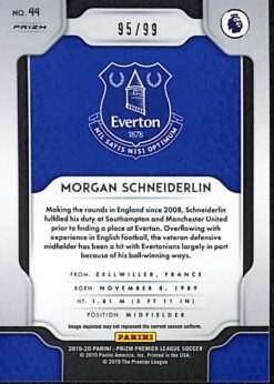This Morgan Schneiderlin Purple Prizm is card number 144 from the 2019-20 Panini Prizm Premier League collection. It is serial-numbered 95/99, with only 99 copies produced worldwide.