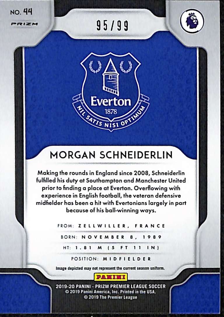 The Purple Prizm parallel is a hobby-exclusive numbered chase, offering a bold purple finish that contrasts with Everton’s royal blue kit. Schneiderlin joined Everton from Manchester United in January 2017 for a fee reported at around £20 million, and this card comes from one of his later Premier League seasons with the club.