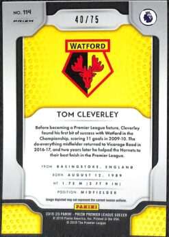This Tom Cleverley Violet Breakaway is card number 114 from the 2019–20 Panini Prizm Premier League release. It is serial-numbered 40/75, with only 75 copies produced.