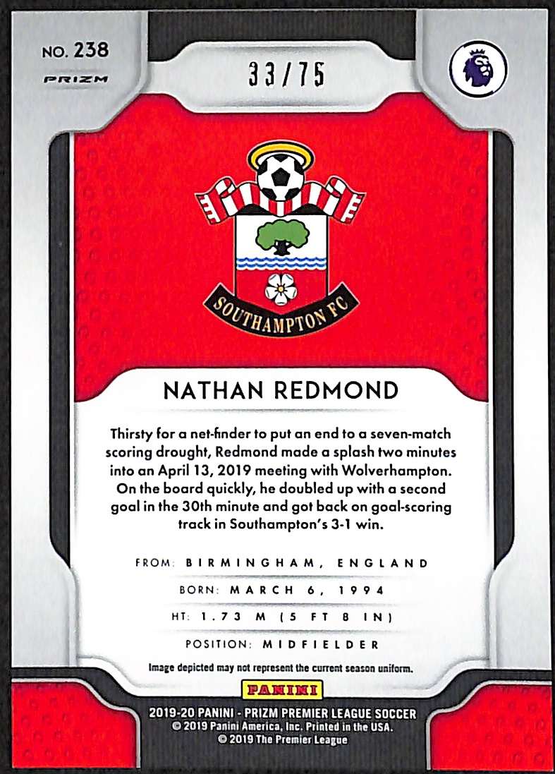 This Nathan Redmond Violet Breakaway is card number 238 from the 2019–20 Panini Prizm Premier League release. It is serial-numbered 33/75, with only 75 copies produced.
