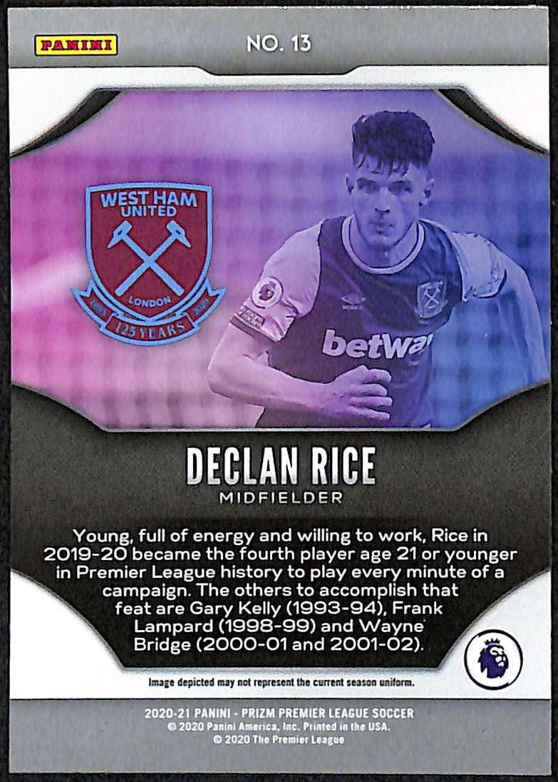 The Fireworks parallel is an insert subset featuring a distinctive multi-colour prismatic pattern. Rice is a West Ham academy graduate who established himself as a key player for the club, winning the Player of the Year award for the 2020-21 season.
