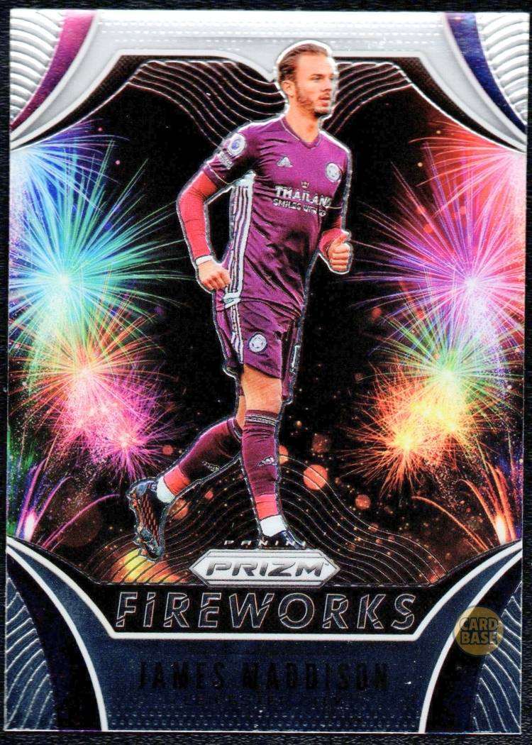 This James Maddison Fireworks is card number 27 from the 2020-21 Panini Prizm Premier League collection.