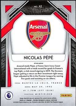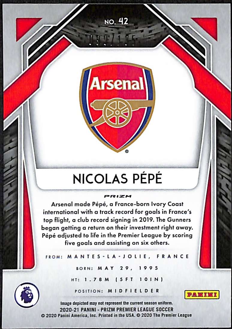 This Nicolas Pépé Red Mojo is card number 42 from the 2020-21 Panini Prizm Premier League collection. It is serial-numbered 99/135, with only 135 copies produced worldwide.