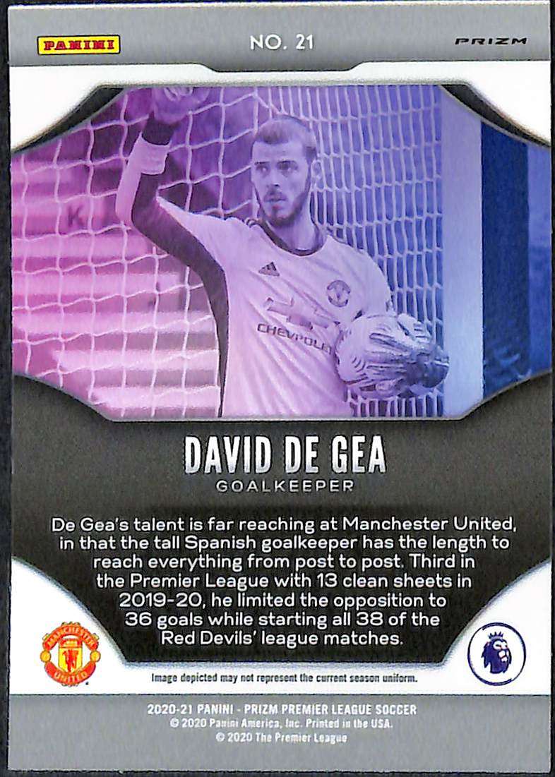 Card number 21 from the 2020–21 Panini Prizm Premier League collection, released as part of the Silver Fireworks parallel within the Fireworks insert line. The card features David De Gea in Manchester United colours during the 2020-21 season, a campaign in which he remained the club’s first-choice keeper despite increasing internal competition. The Silver Fireworks variation adds a reflective chrome-style finish that distinguishes it from the standard Fireworks insert.