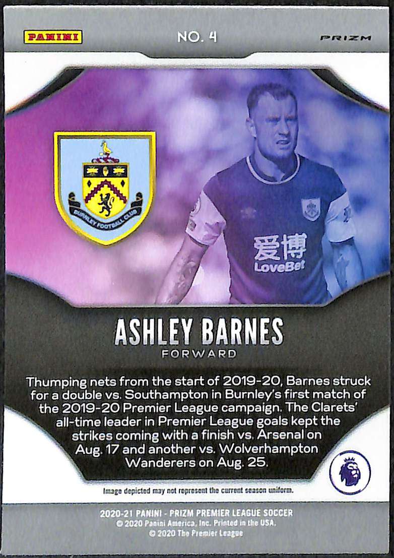 Card number 4 from the 2020–21 Panini Prizm Premier League collection, released as part of the Silver Fireworks parallel within the Fireworks insert line. The card features Ashley Barnes in Burnley colours during the 2020–21 Premier League season, when he remained a key forward under Sean Dyche. The Silver Fireworks variation adds a reflective chrome-style finish that sets it apart from the standard Fireworks insert in Panini’s second Premier League Prizm release.