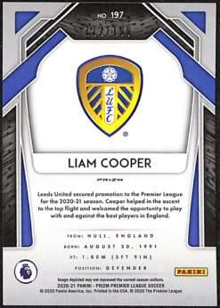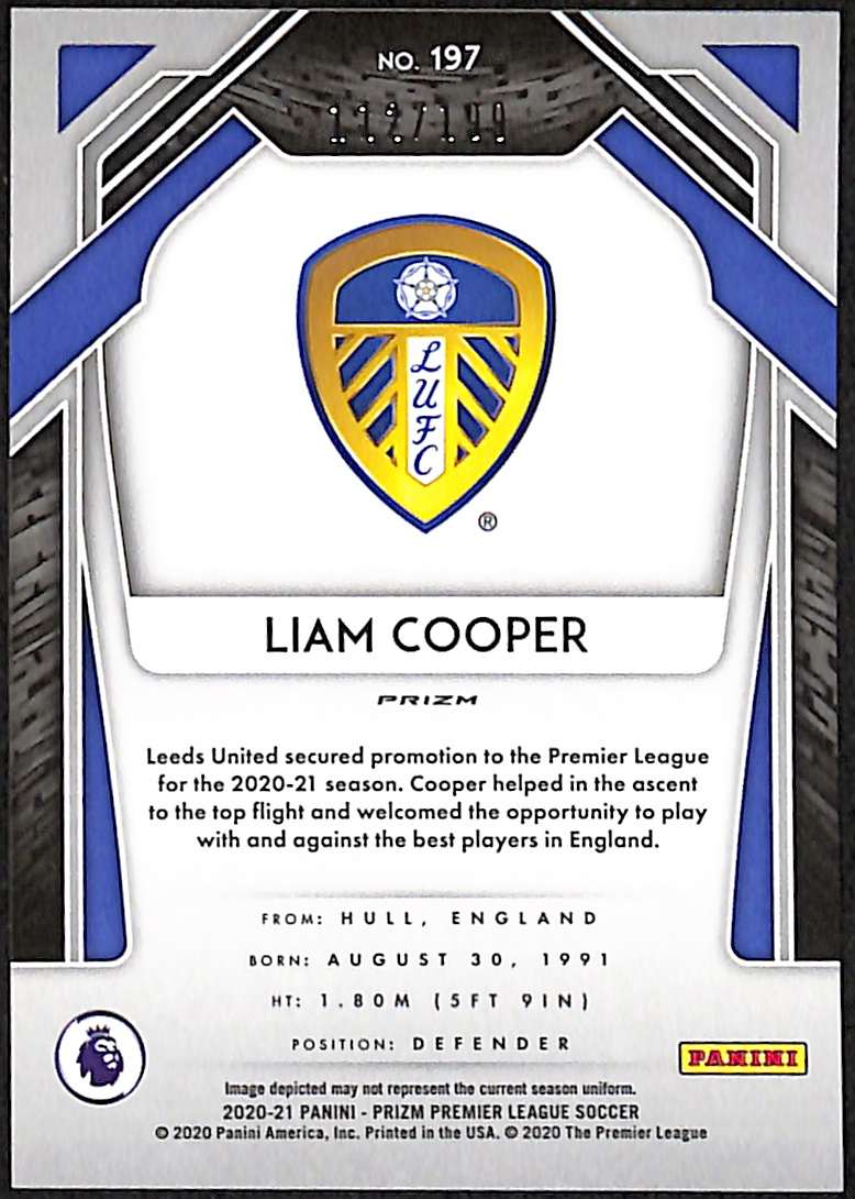 Liam Cooper Blue Prizm card #197 numbered 112/199 from 2020-21 Panini Prizm Premier League.