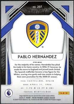 Rare Pablo Hernandez Blue Prizm parallel from the 2020-21 Panini Prizm Premier League collection. Card number 207 features the Leeds United legend in his promotion-winning season. Hernandez initially joined Leeds on loan from Al-Arabi in 2016 before signing permanently for virtually nothing in January 2017. The Spanish playmaker, nicknamed “El Mago” (The Magician) by Leeds fans, was instrumental in their return to the Premier League. Numbered 100 of only 199 produced.