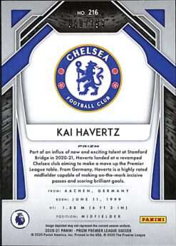The Blue Prizm parallel is a hobby-exclusive numbered chase. Its colour design pairs neatly with Chelsea’s home kit. Havertz joined Chelsea from Bayer Leverkusen in September 2020 for a reported £62 million fee, one of the highest transfer fees in the club’s history.