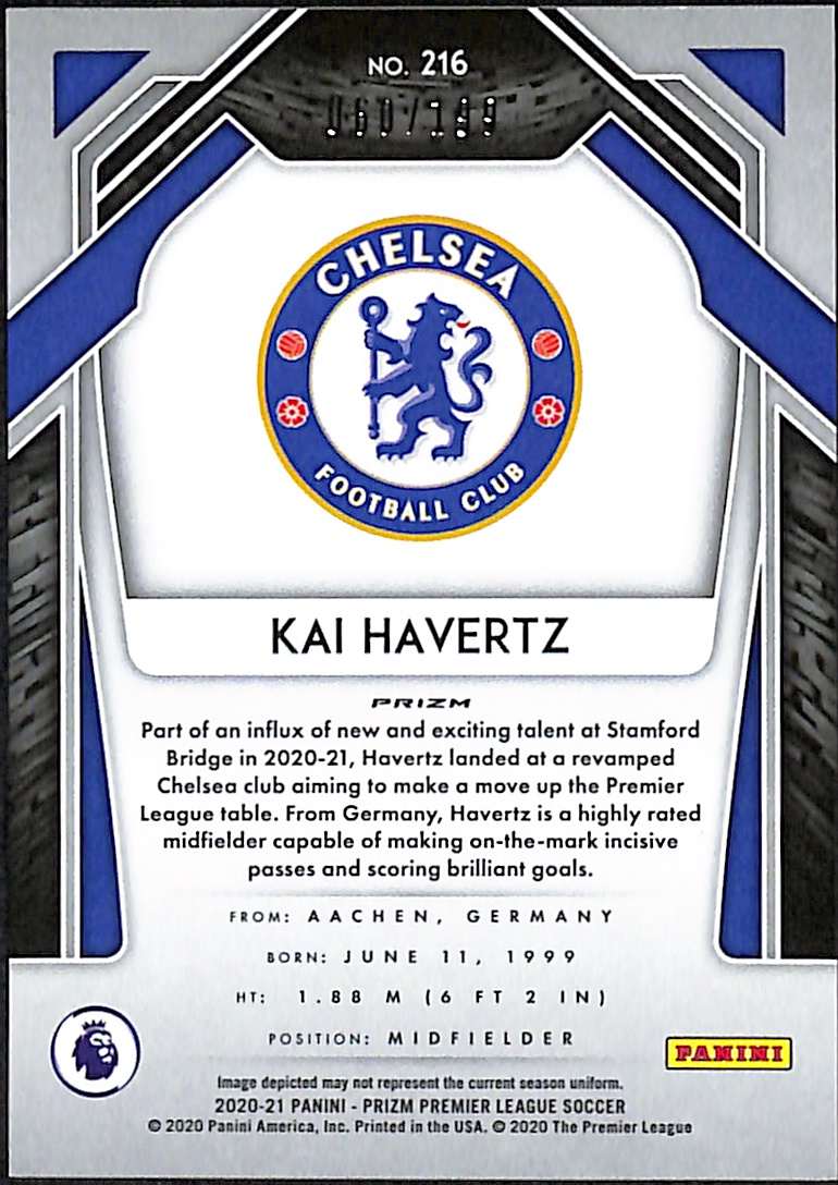This Kai Havertz Blue Prizm is card number 216 from the 2020-21 Panini Prizm Premier League collection. It is serial-numbered 60/199, with only 199 copies produced worldwide.