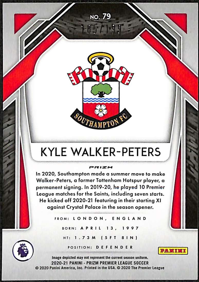 Rare Kyle Walker-Peters Blue Prizm parallel from the 2020-21 Panini Prizm Premier League collection. Card number 79 features the Southampton full-back. Walker-Peters joined Southampton from Tottenham for £12 million in August 2020 after a successful loan spell. Part of England’s U20 World Cup winning squad in 2017. Numbered 185 of only 199 produced.