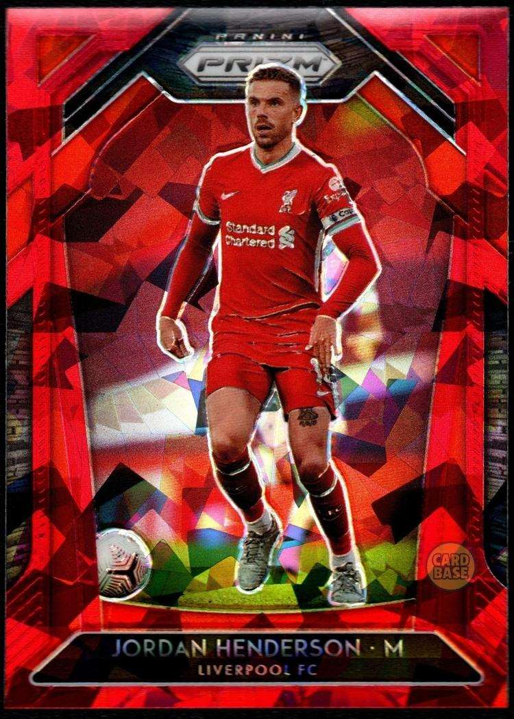 Jordan Henderson Liverpool Red Ice parallel from the 2020-21 Panini Prizm Premier League collection. The brilliant red ice refractor pattern showcases Liverpool’s iconic captain in stunning detail. The England midfielder joined Liverpool from Sunderland in June 2011 for £16 million and went on to become one of the club’s most successful captains.