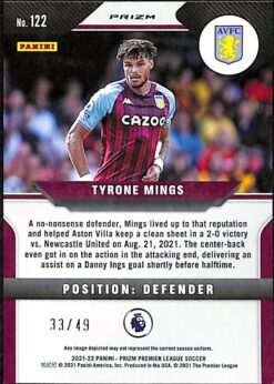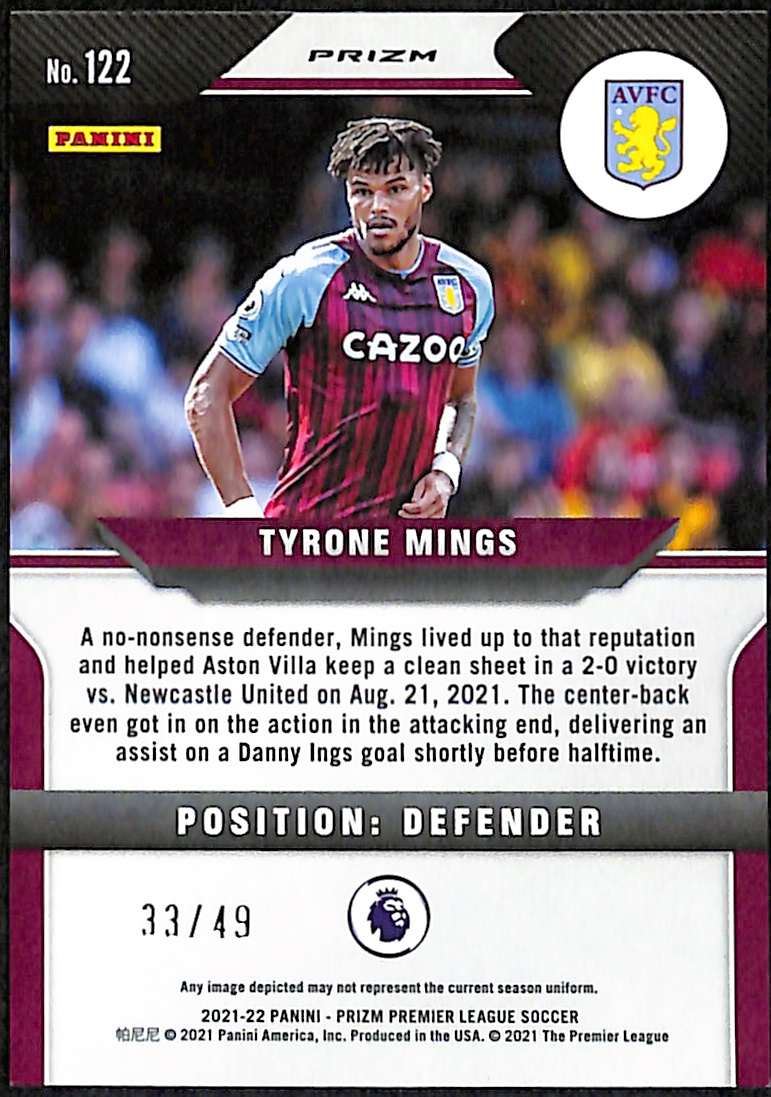 This Tyrone Mings Purple Ice is card number 122 from the 2021–22 Panini Prizm Premier League release. It is serial-numbered 33/49, with only 49 copies produced.