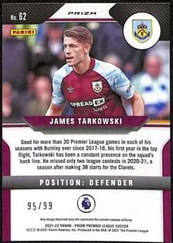 This James Tarkowski Purple Prizm is card number 62 from the 2021–22 Panini Prizm Premier League release. It is serial-numbered 95/99, with only 99 copies produced.