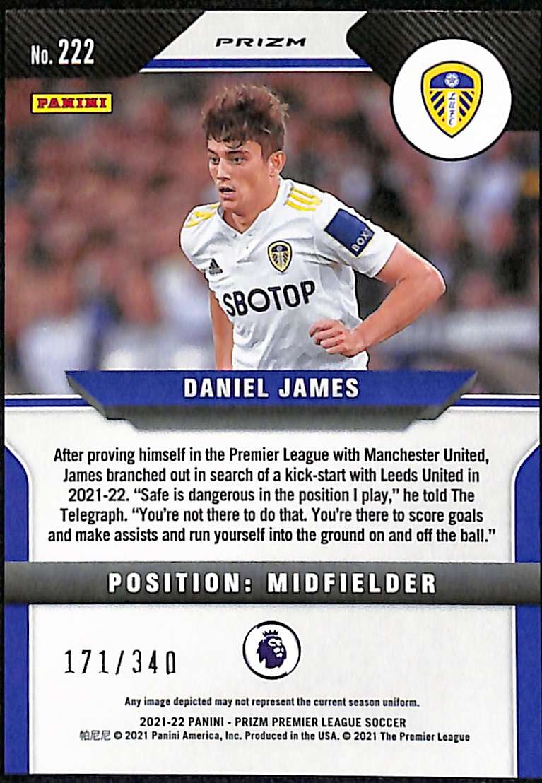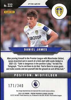 Rare Daniel James Blue Prizm parallel from the 2021-22 Panini Prizm Premier League collection. Card number 222 features the Leeds United winger. James joined Leeds from Manchester United in August 2021 for £25 million. Numbered 171 of only 340 produced.