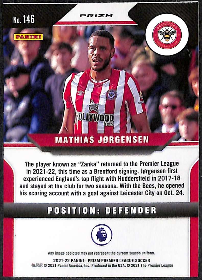 Mathias “Zanka” Jorgensen of Brentford features on this Green Wave parallel from the 2021-22 Panini Prizm Premier League collection. This vibrant green parallel showcases distinctive wave patterns that create stunning visual depth. The prizm refractor finish delivers exceptional light refraction, making the card shimmer brilliantly from every angle. Jorgensen joined Brentford in September 2021 as a free agent from Fenerbahce, bringing vast experience from five different European leagues.