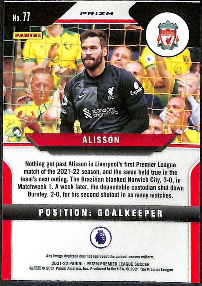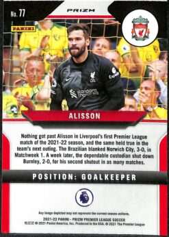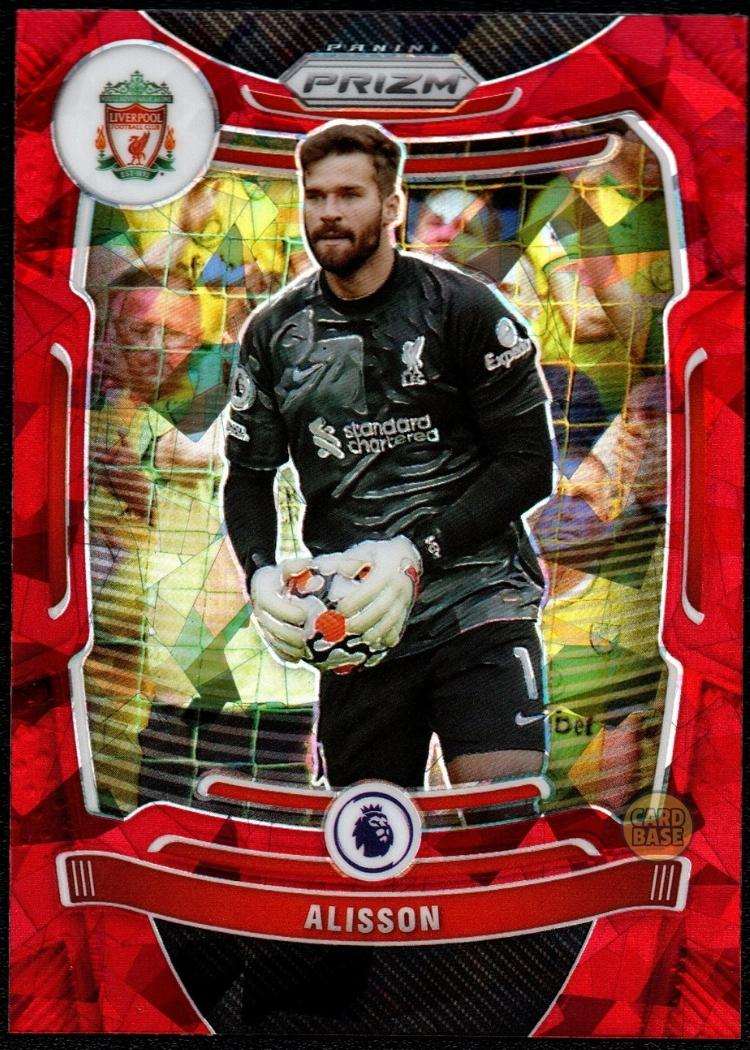 2021-22 Panini Prizm Premier League – Alisson Red Ice parallel, Card 77.