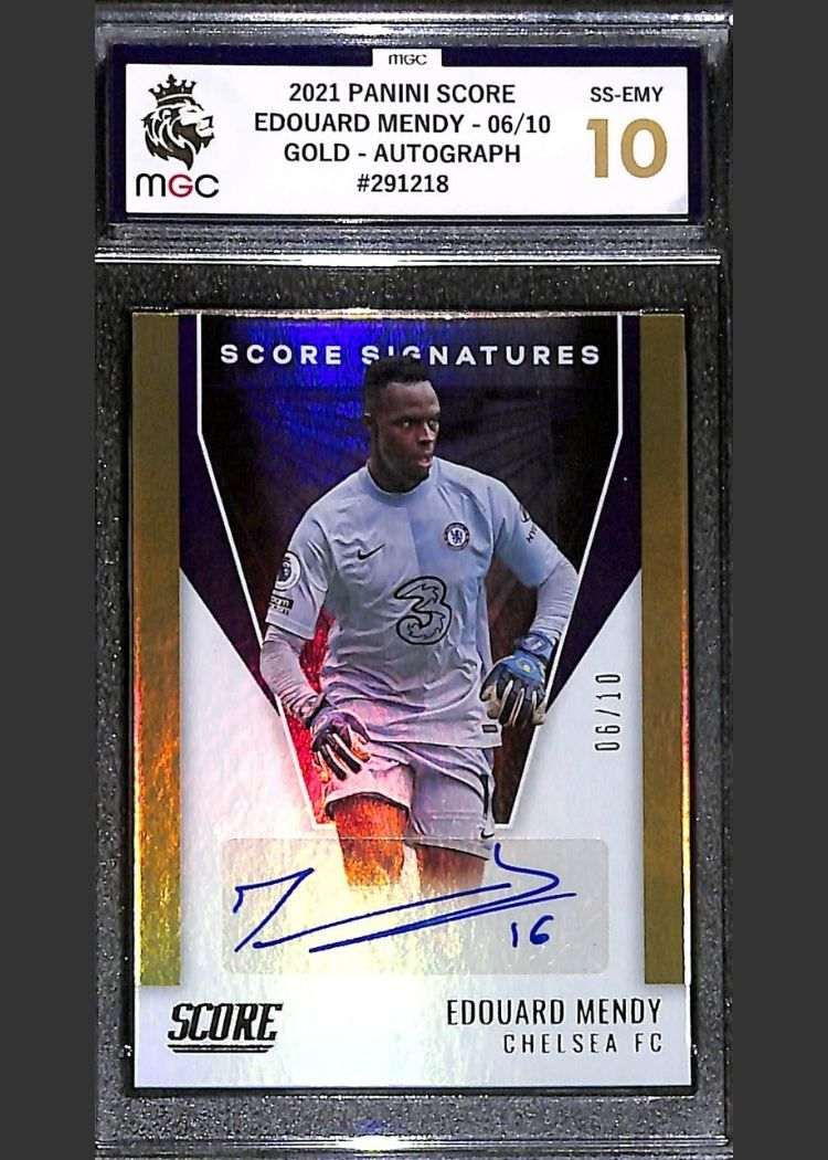This Édouard Mendy autograph card is from the 2021 Panini Score collection. The Gold parallel is numbered 6 of 10. The card has been graded MGC 10 Gem Mint by Majesty Grading Company, the highest possible grade.