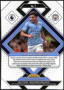 Card number 1 from the 2022–23 Panini Prizm Premier League collection, issued as part of the Emergent insert line. The card features Julián Álvarez in Manchester City colours during his first Premier League season following his transfer from River Plate. Recognised as one of the key rookies of the 2022–23 set, this unnumbered insert highlights emerging players and carries the reflective Prizm finish typical of Panini’s Premier League releases.