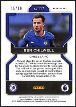 This Ben Chilwell Gold Breakaway is card number 117 from the 2022-23 Panini Prizm Premier League collection. The card is serial-numbered 5/10, with only 10 copies produced worldwide.