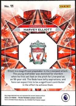 Card number 11 from the 2022–23 Panini Prizm Premier League collection, issued as part of the Kaleidoscopic insert line. The card features Harvey Elliott in Liverpool colours during the 2022–23 season, when he had established himself as a key part of the squad’s attacking rotation. An unnumbered insert within Panini’s new Kaleidoscopic range, it carries a refractor-style geometric finish that sets it apart from the standard insert lines.