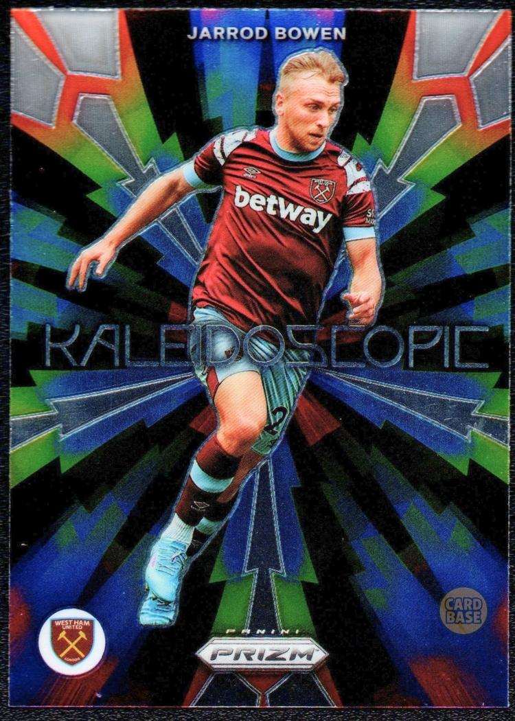 Card number 24 from the 2022–23 Panini Prizm Premier League collection, issued as part of the Kaleidoscopic insert line. The card features Jarrod Bowen in West Ham United colours during the 2022-23 season, when he established himself as one of the club’s most important attacking players. The Kaleidoscopic insert carries a distinctive refractor-style geometric design, marking one of the more visually striking parallels in the Prizm Premier League series.