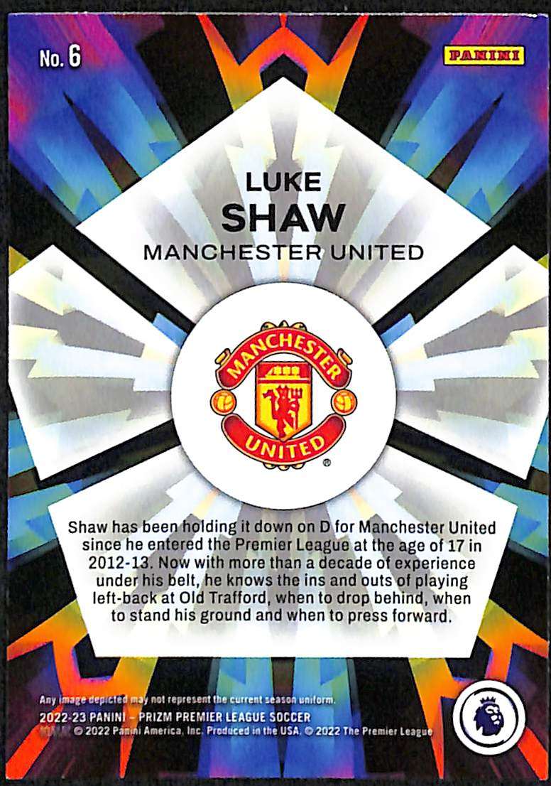 Card number 6 from the 2022–23 Panini Prizm Premier League collection, released as part of the Kaleidoscopic insert line. The card features Luke Shaw in Manchester United colours during the 2022–23 season, reflecting his established role as the club’s first-choice left-back. An unnumbered insert within Panini’s Kaleidoscopic range, it carries the distinctive refractor-style finish introduced for this insert line in the Premier League Prizm series.