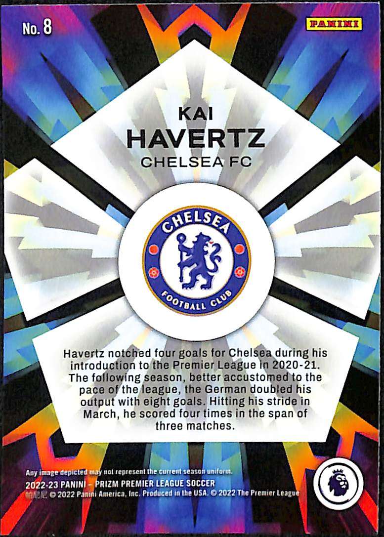 Card number 8 from the 2022–23 Panini Prizm Premier League collection, issued as part of the Kaleidoscopic insert line. The card features Kai Havertz in Chelsea colours during the 2022–23 season, when he recorded 7 league goals and made a total of 35 appearances. The Kaleidoscopic insert carries a distinctive refractor-style geometric finish and forms one of the standout parallel lines within the Prizm Premier League series.