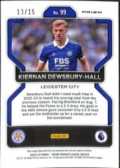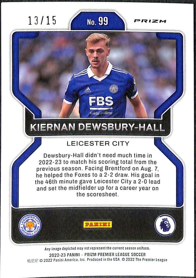 This Kiernan Dewsbury-Hall Red Blue Purple Choice is card number 99 from the 2022-23 Panini Prizm Premier League collection. It is serial-numbered 13/15, with only 15 copies produced worldwide.