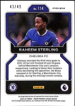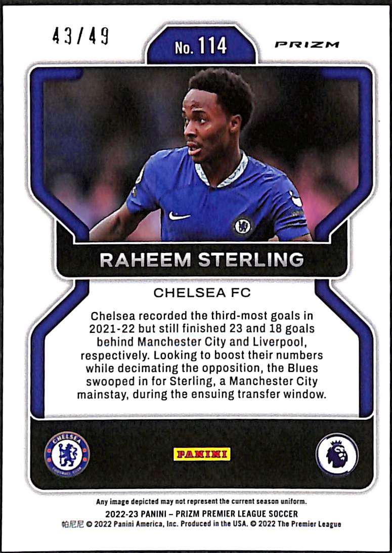 Sterling joined Chelsea ahead of the 2022–23 season following a successful spell at Manchester City, where he won multiple league titles and domestic trophies. This card represents one of his earliest numbered Prizm issues for Chelsea, produced in a limited print run of just 49 copies worldwide.