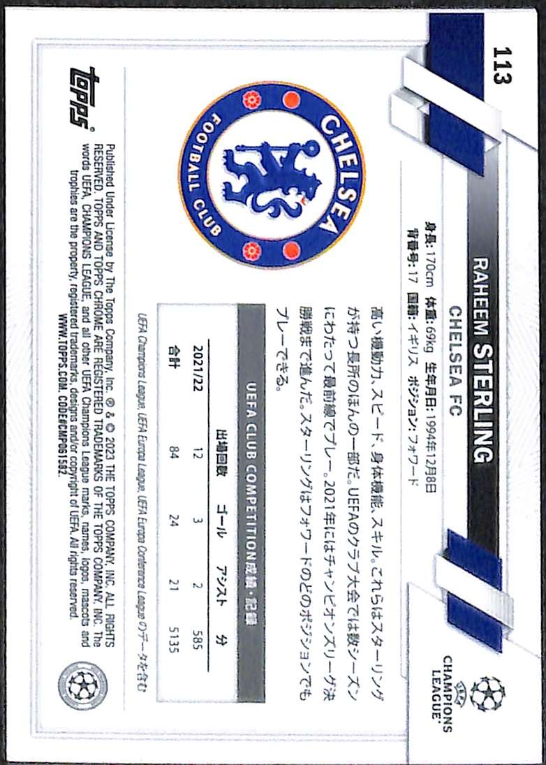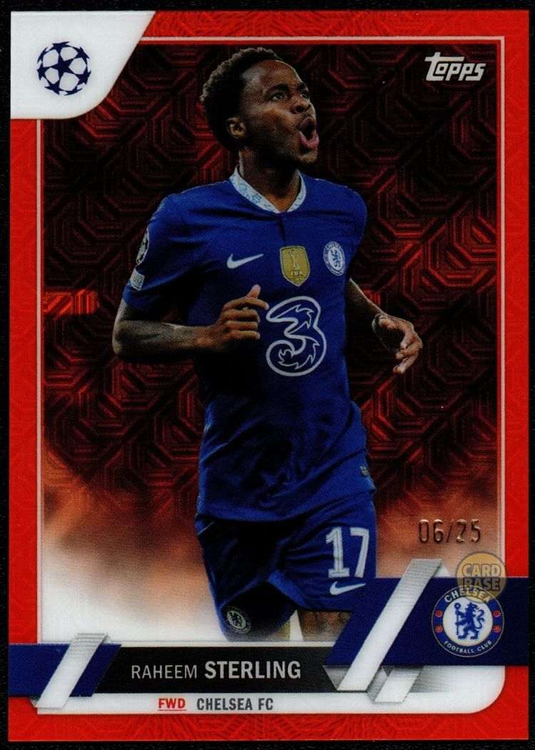 The Orange Mojo Refractor parallel was exclusive to the Japan Edition release of Topps UEFA cards. The vibrant orange refractor pattern contrasts with Chelsea’s blue kit, capturing Sterling in his debut season following his £47.5 million transfer from Manchester City in July 2022. The Japan Edition was a special release for the Japanese market, featuring unique parallels not available in standard UEFA releases.