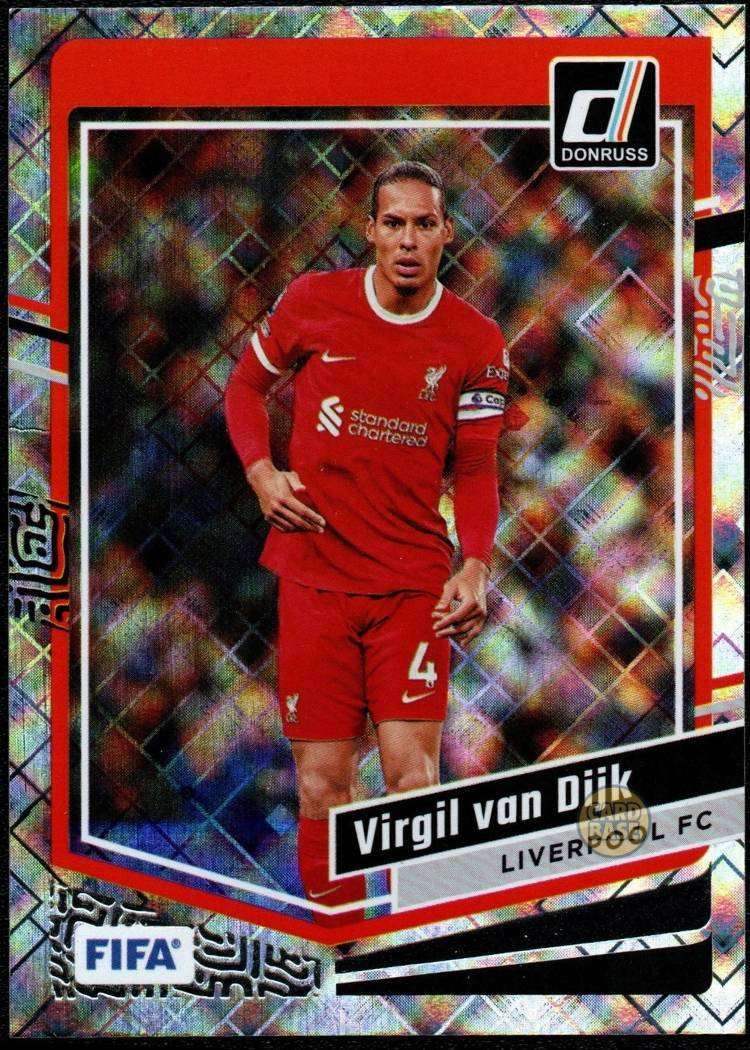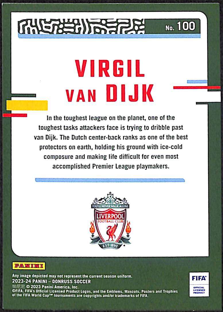 The Diamond parallel (#100) from the 2023-24 Panini Donruss FIFA collection features Virgil van Dijk in Liverpool colours.