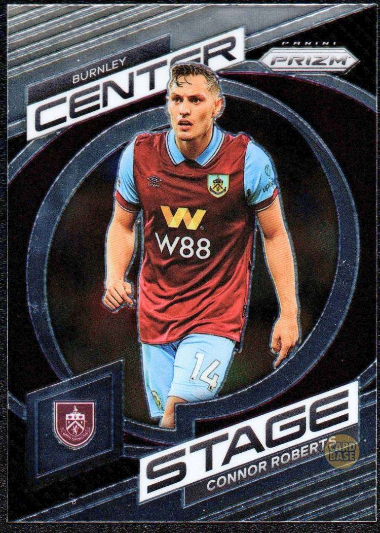 Card number 18 from the 2023–24 Panini Prizm Premier League collection, issued as part of the Centre Stage insert line. The card features Connor Roberts in Burnley colours during the 2023–24 season, following the club’s promotion back to the Premier League. The Centre Stage insert is a premium line within the Prizm release and features a reflective green design that pairs neatly with Burnley’s claret and blue kit.