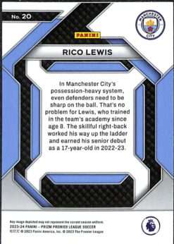 Card number 20 from the 2023–24 Panini Prizm Premier League collection, released as part of the Emergent insert line. The card features Rico Lewis in Manchester City colours during his debut full senior season, following his promotion from the academy. The Emergent insert line highlights Premier League players at the start of their senior journeys and carries the reflective Prizm finish standard to the series.