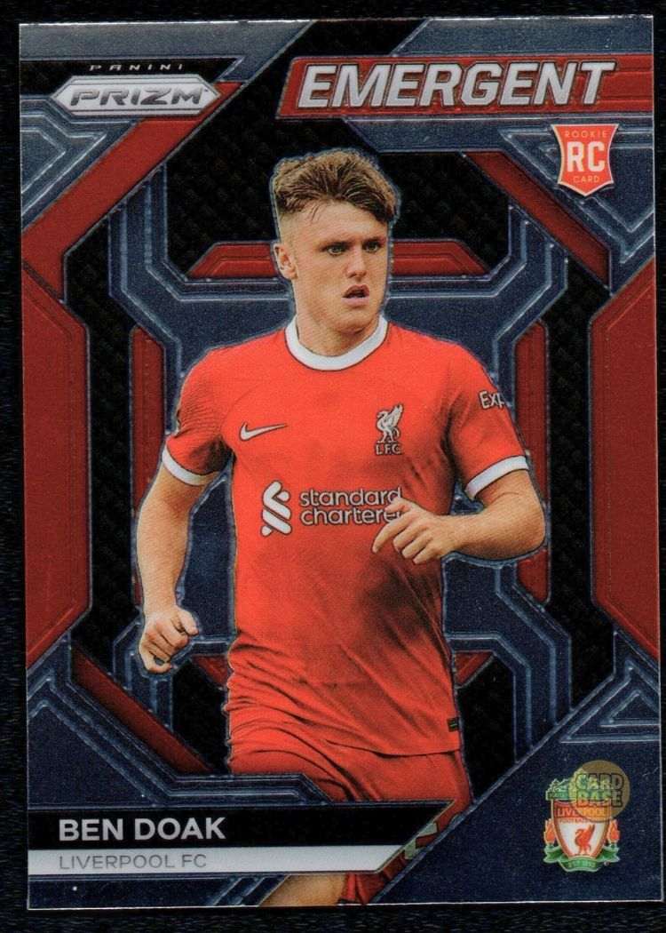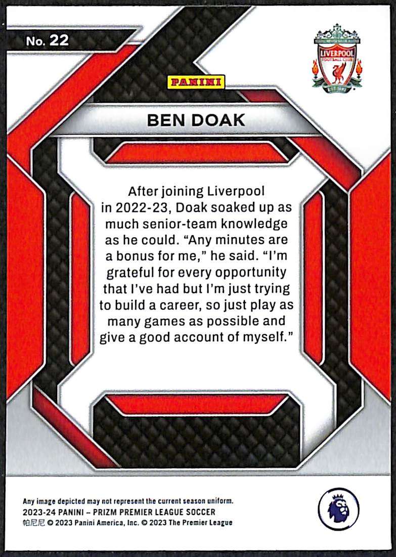 Card number 22 from the 2023–24 Panini Prizm Premier League collection, issued as part of the Emergent insert line. The card features Ben Doak in Liverpool colours during his first full senior season following his move from Celtic, presented under the “Rookie” designation. The Emergent insert highlights emerging Premier League talents and carries the standard reflective Prizm finish.