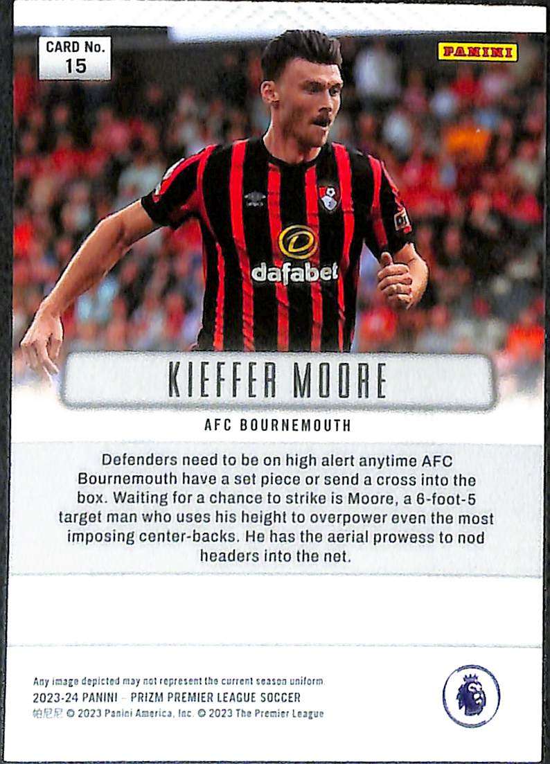 Card number 15 from the 2023–24 Panini Prizm Premier League collection, released as part of the Flashback 2012 insert line. The card features Kieffer Moore in AFC Bournemouth colours during the 2023-24 season. The Flashback 2012 parallel recreates the design of Panini’s 2012 release and pairs with Bournemouth’s red and black home kit to create visual contrast.